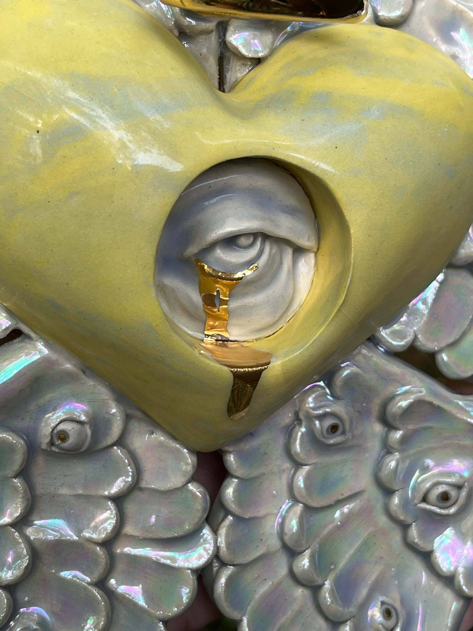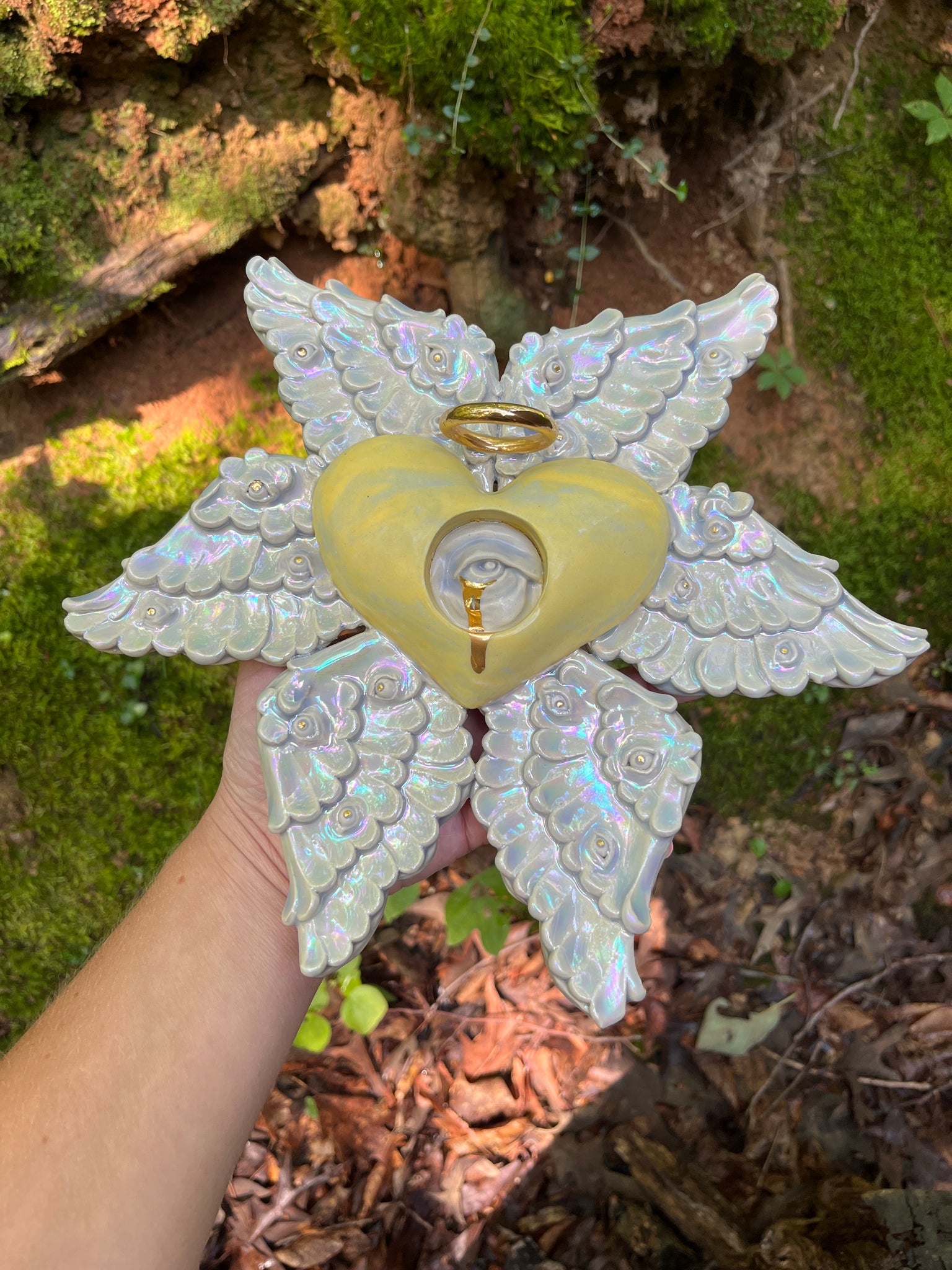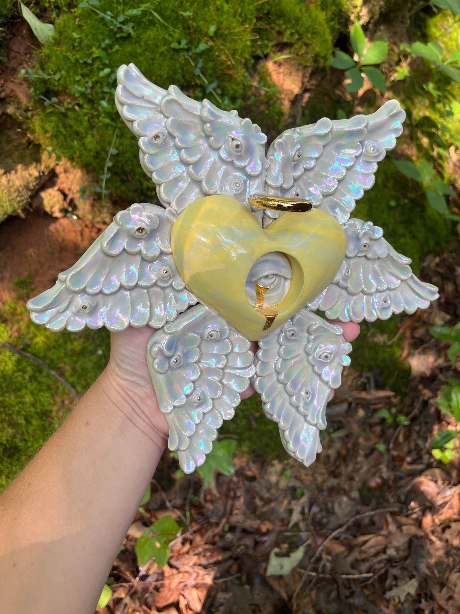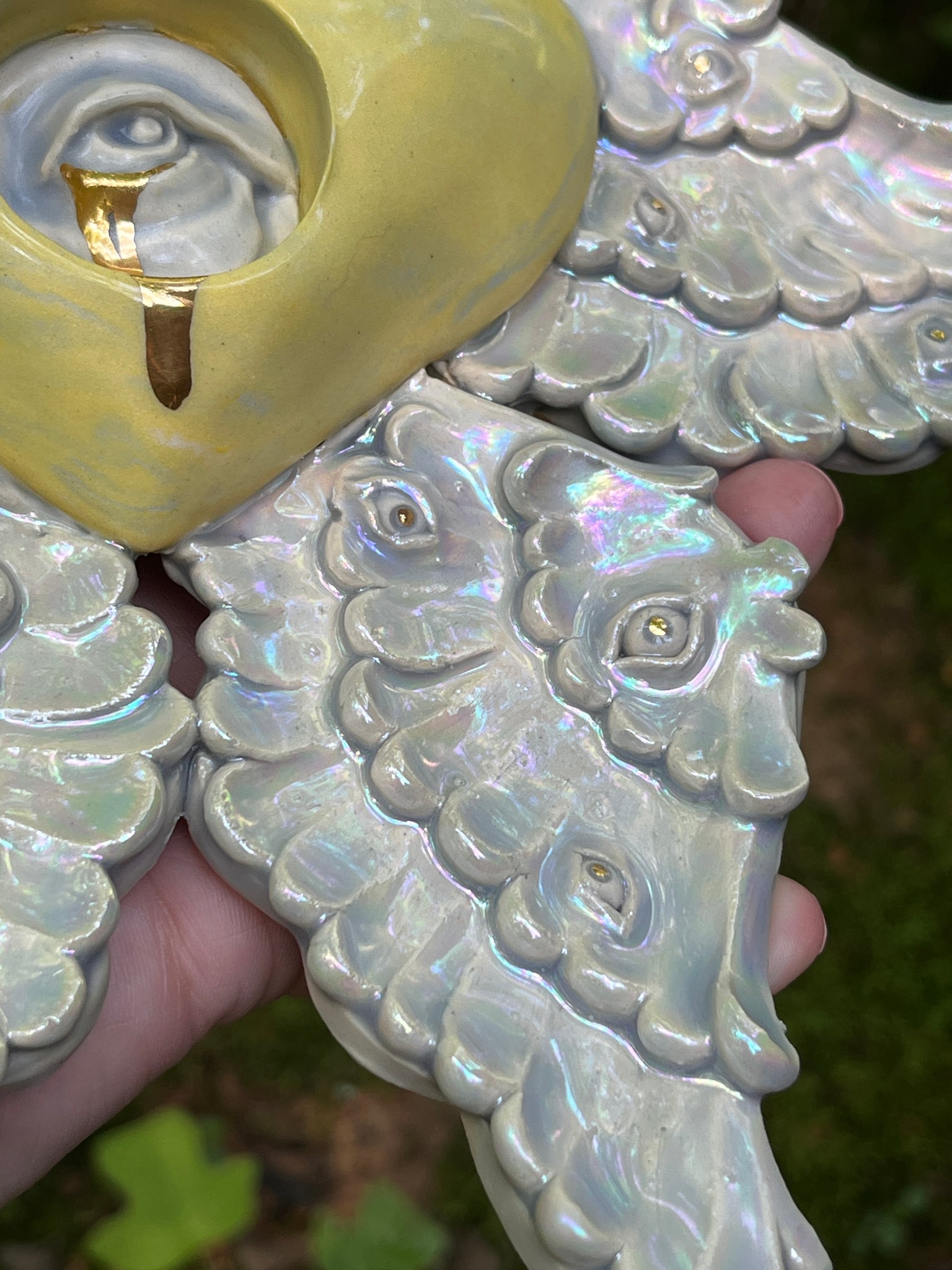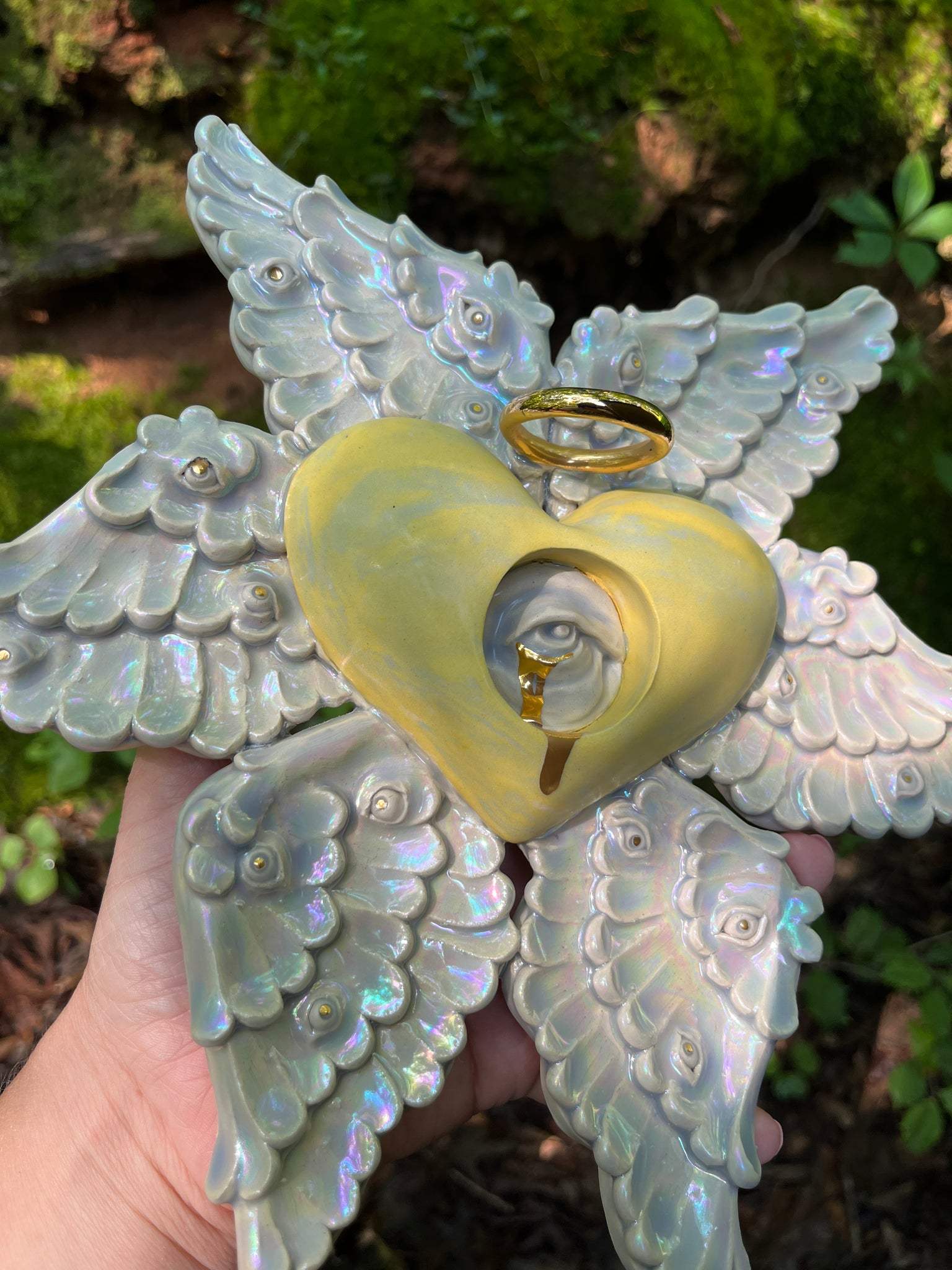 This Mourning Star wall sculpture is hand sculpted, featuring a halo and a heart made from yellow and blue marbled clay. The eye includes a tear that collects at the base of the tunnel. The wings are finished with mother of pearl, and each eye contains a golden pupil.