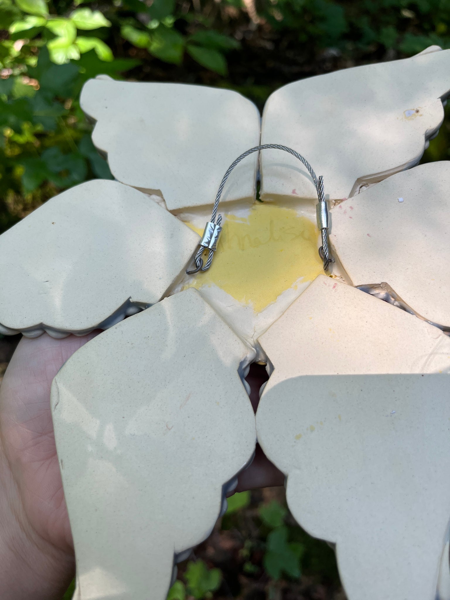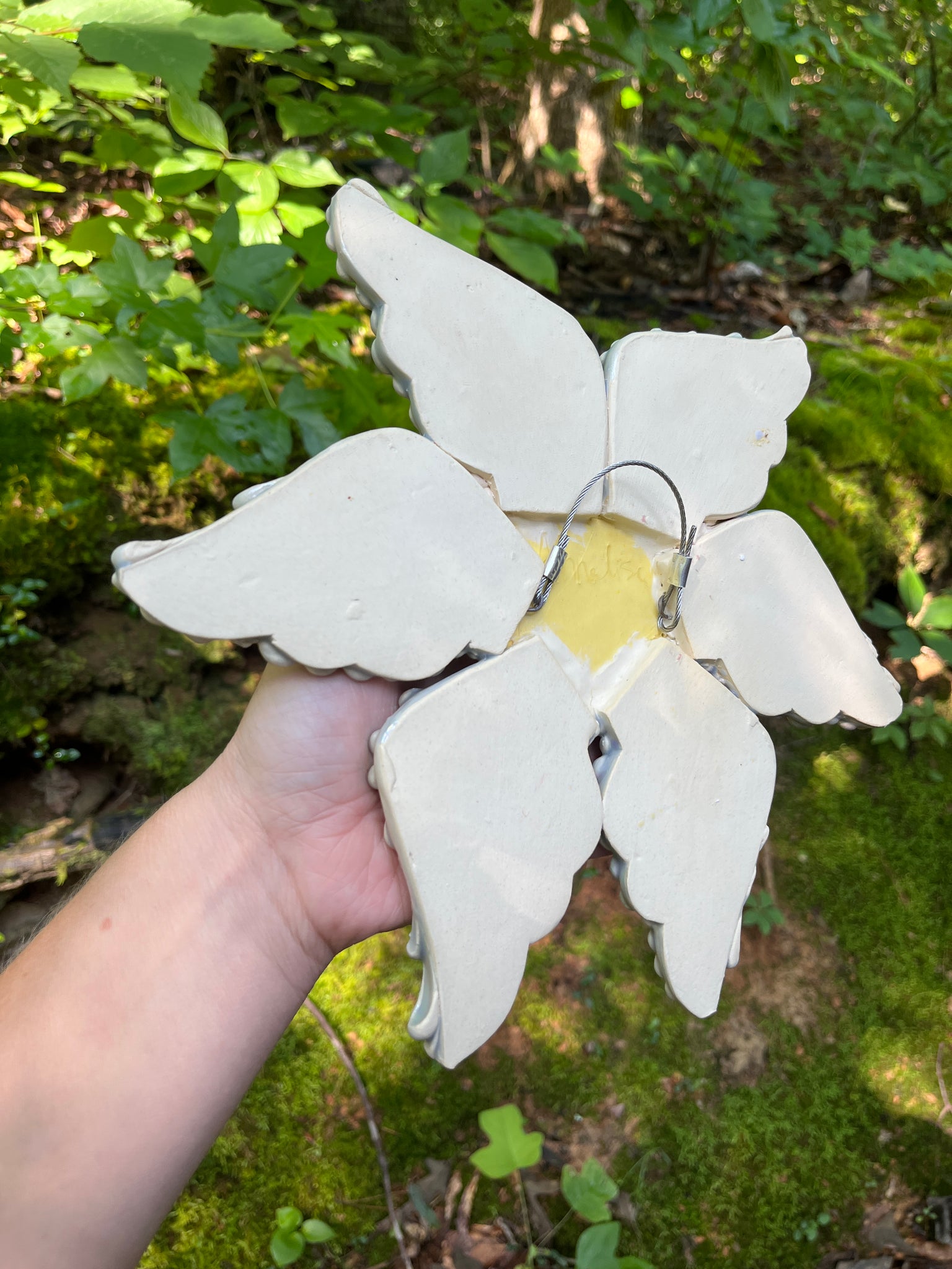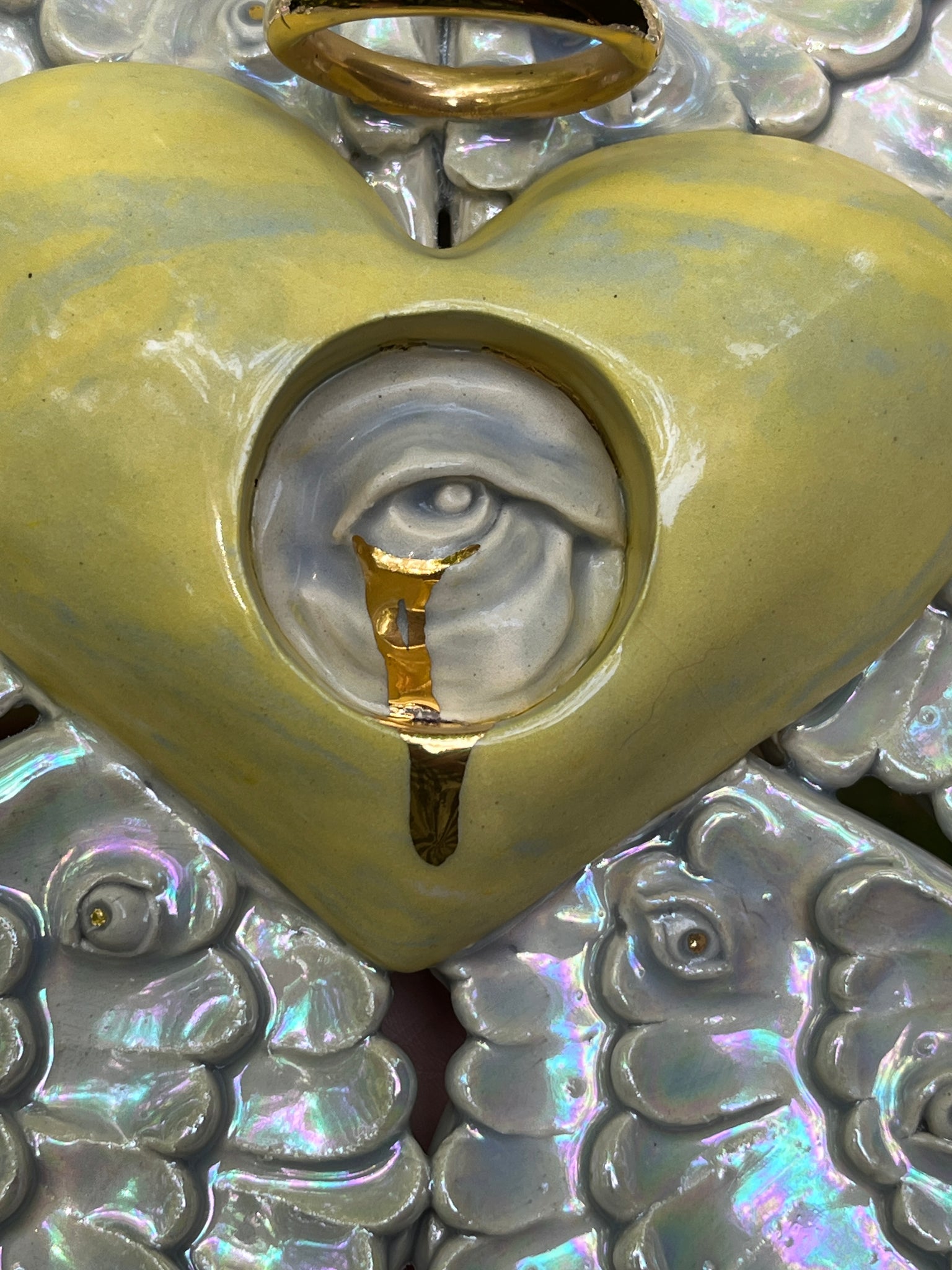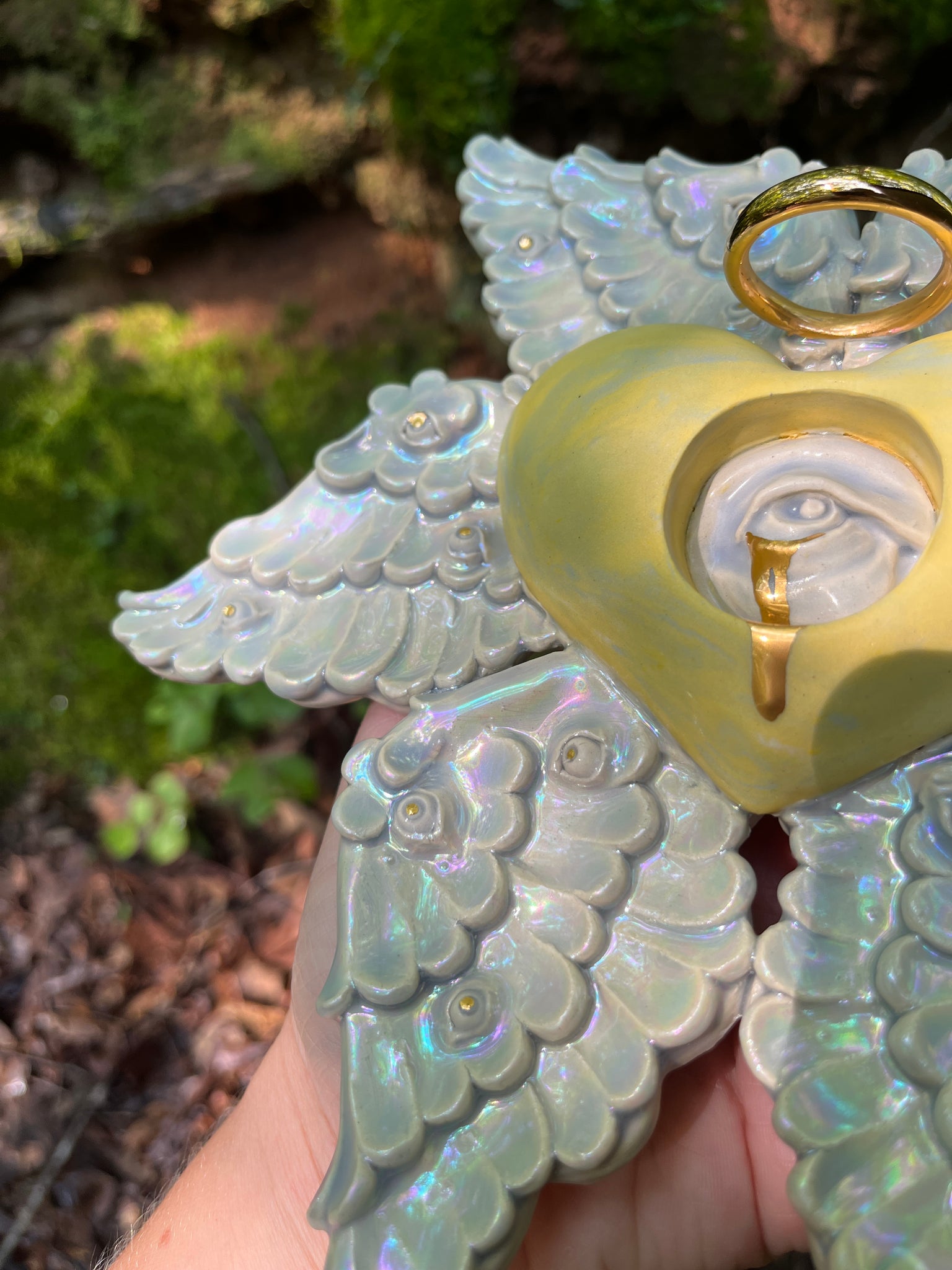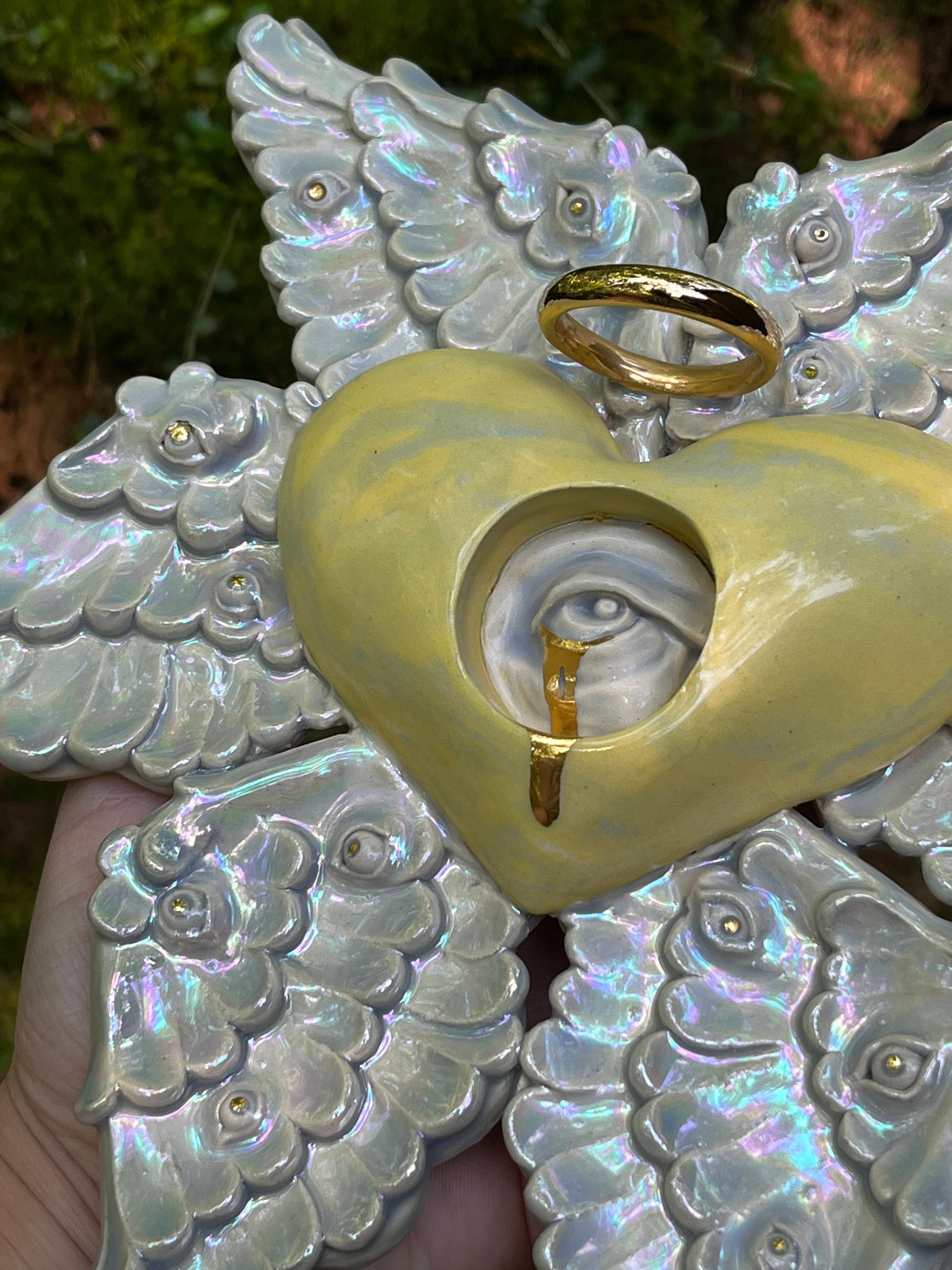 This Mourning Star wall sculpture is hand sculpted, featuring a halo and a heart made from yellow and blue marbled clay. The eye includes a tear that collects at the base of the tunnel. The wings are finished with mother of pearl, and each eye contains a golden pupil.