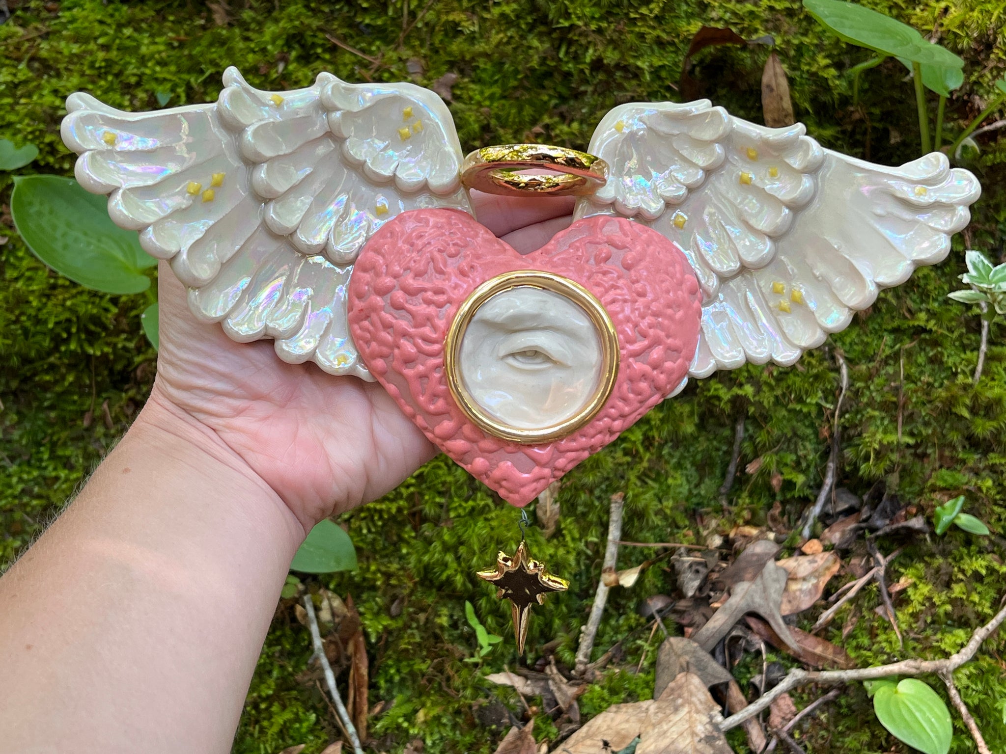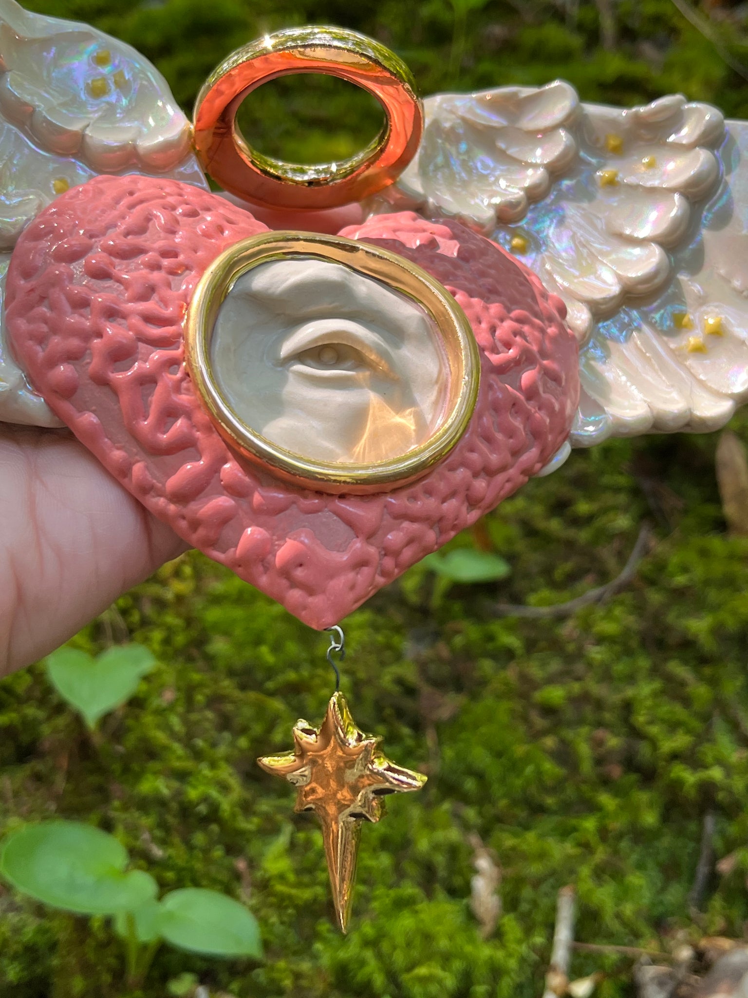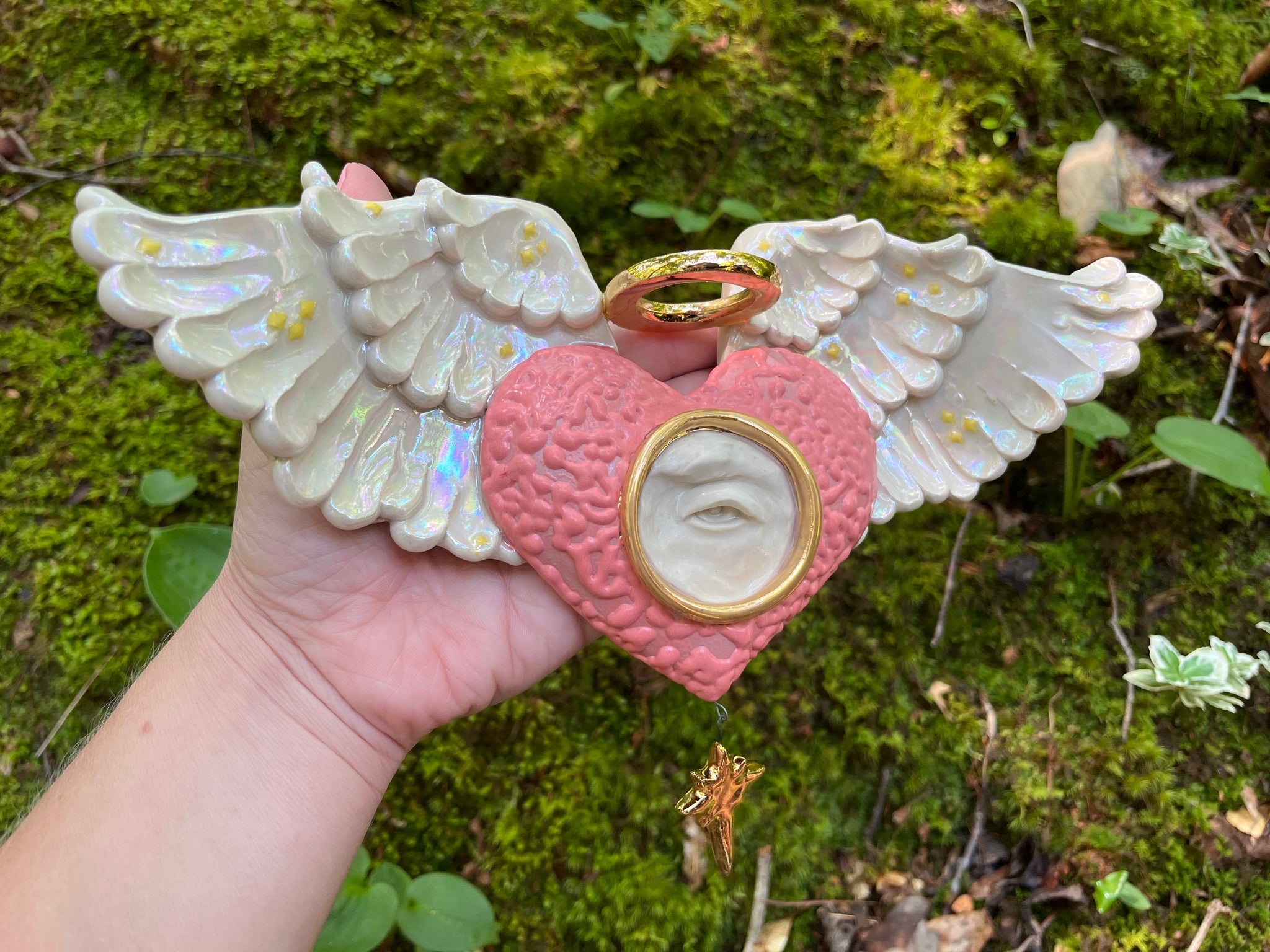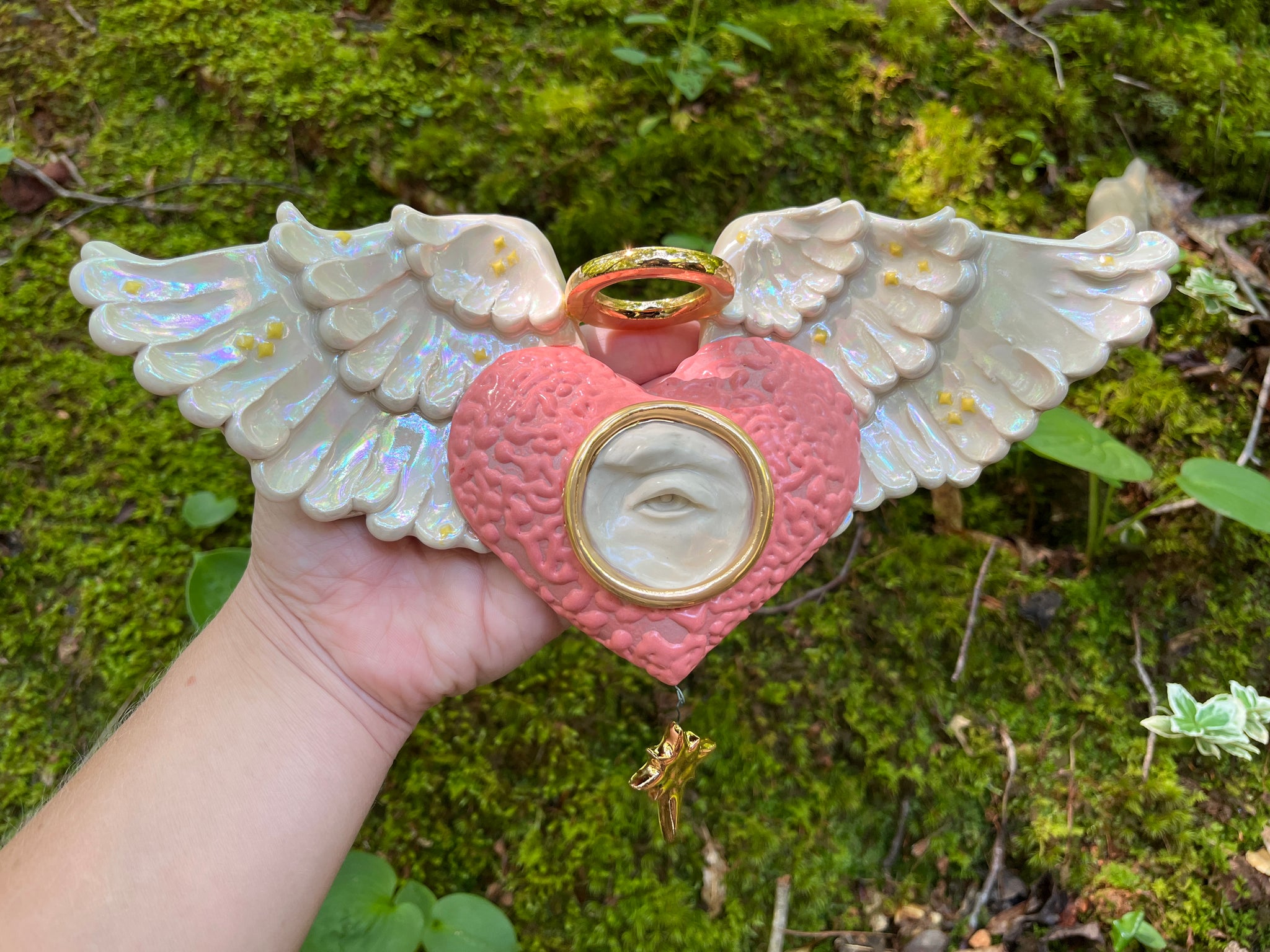 This sculpted winged heart features a vigilant eye at its center, crowned by a golden halo.