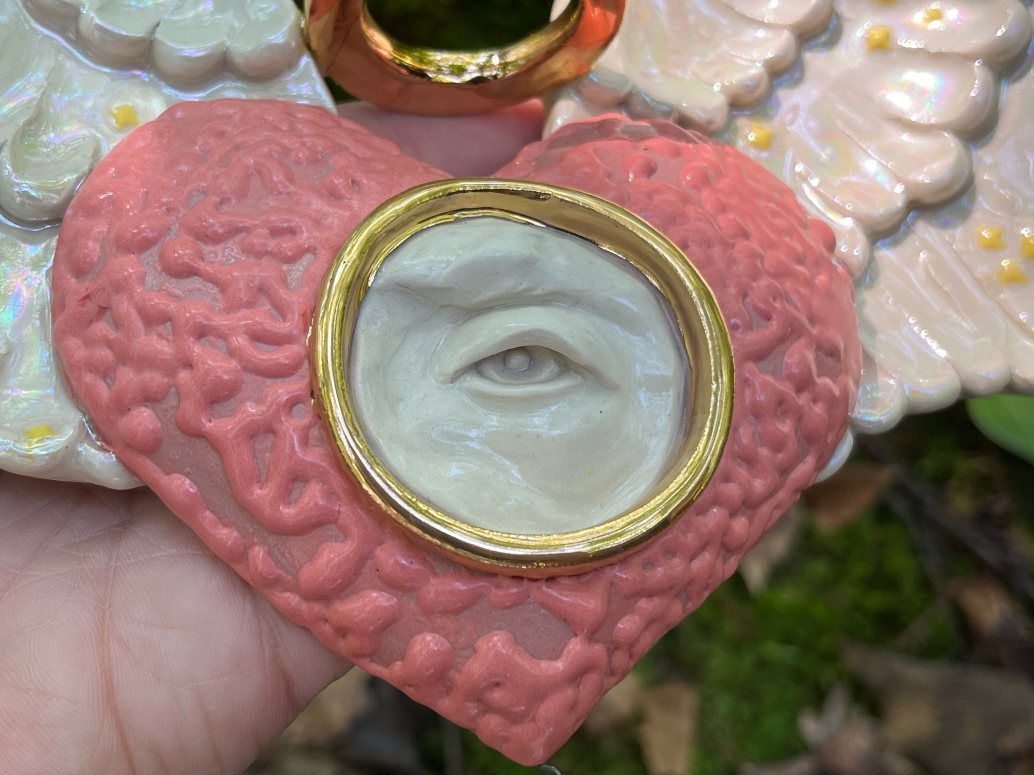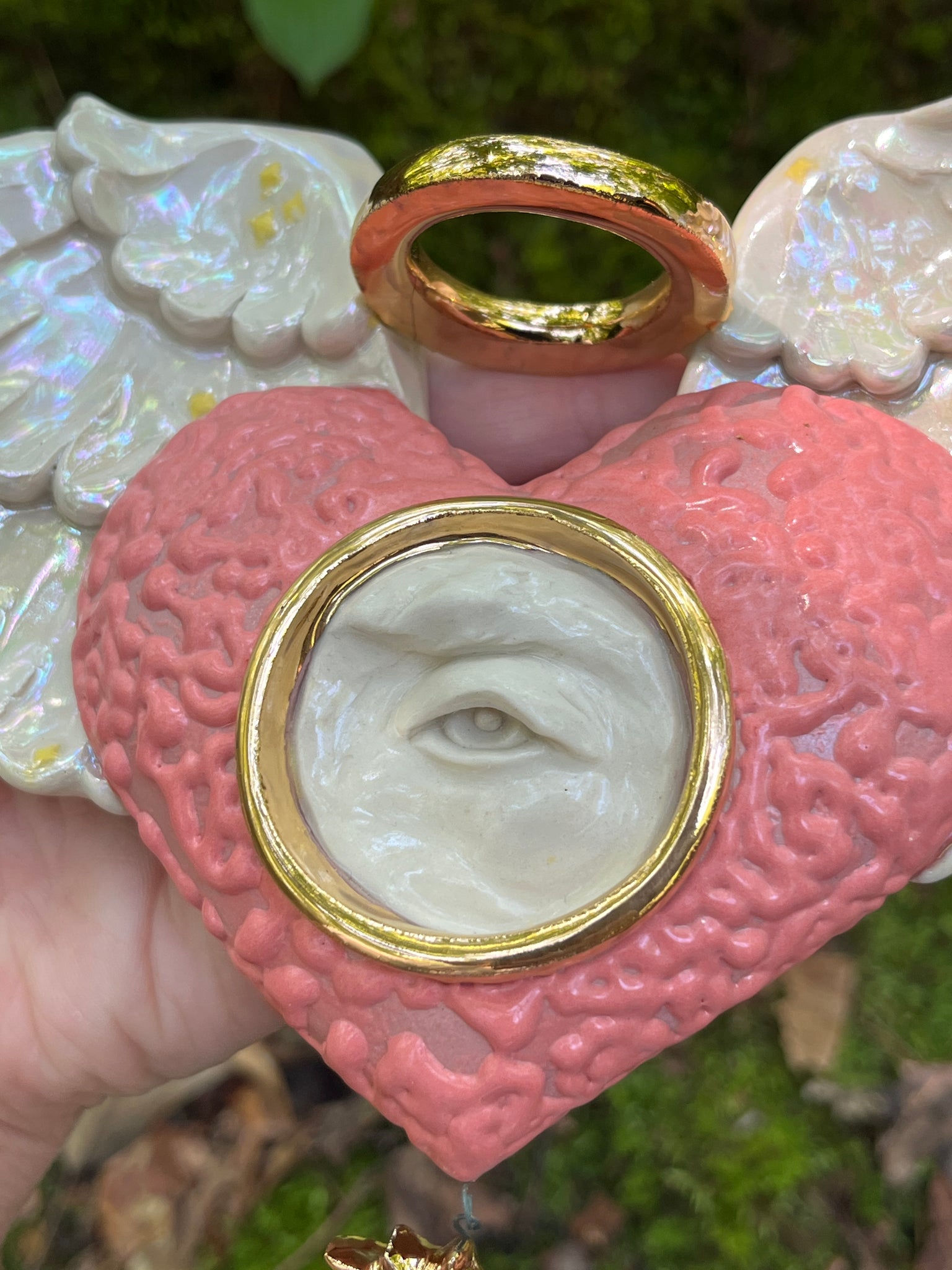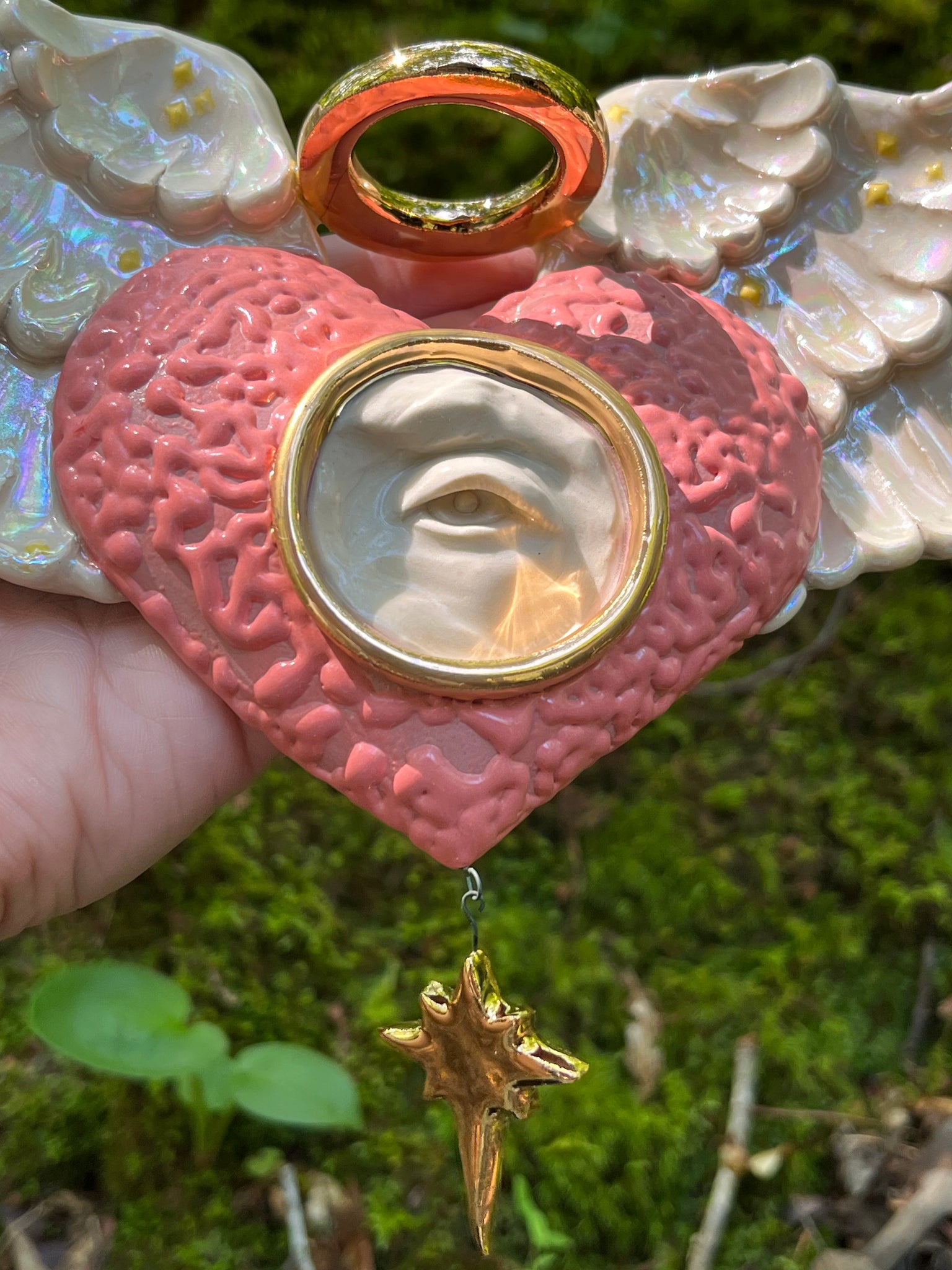 This sculpted winged heart features a vigilant eye at its center, crowned by a golden halo.