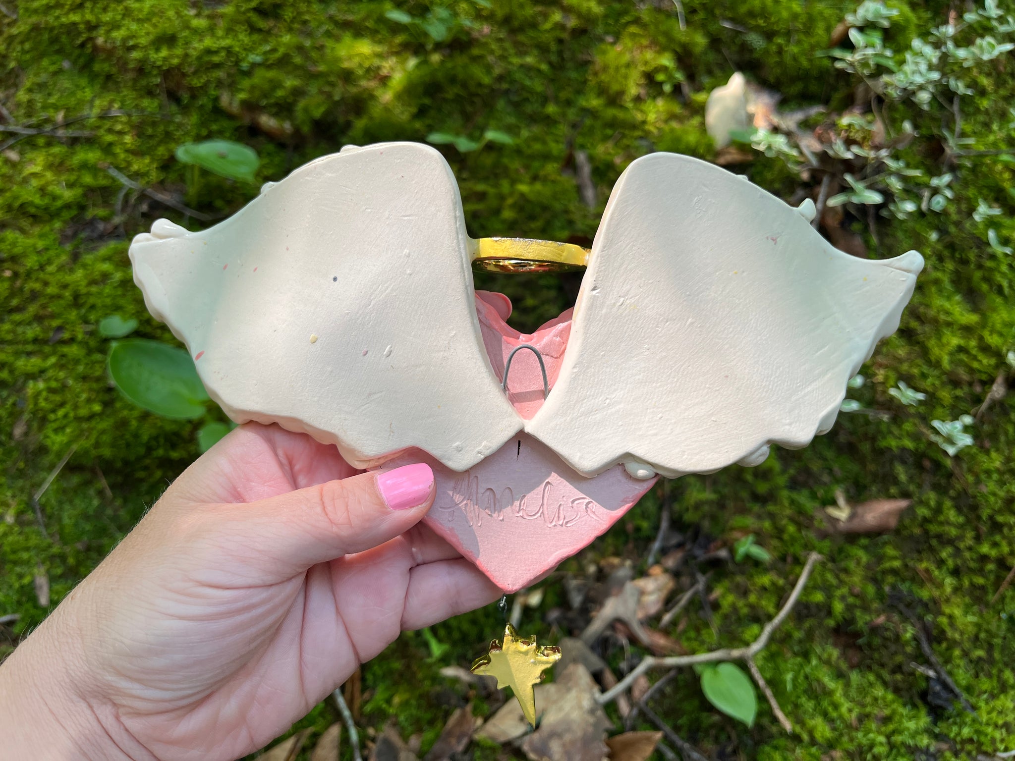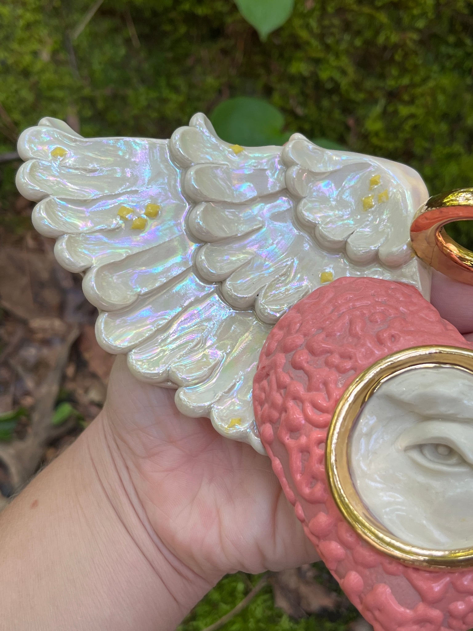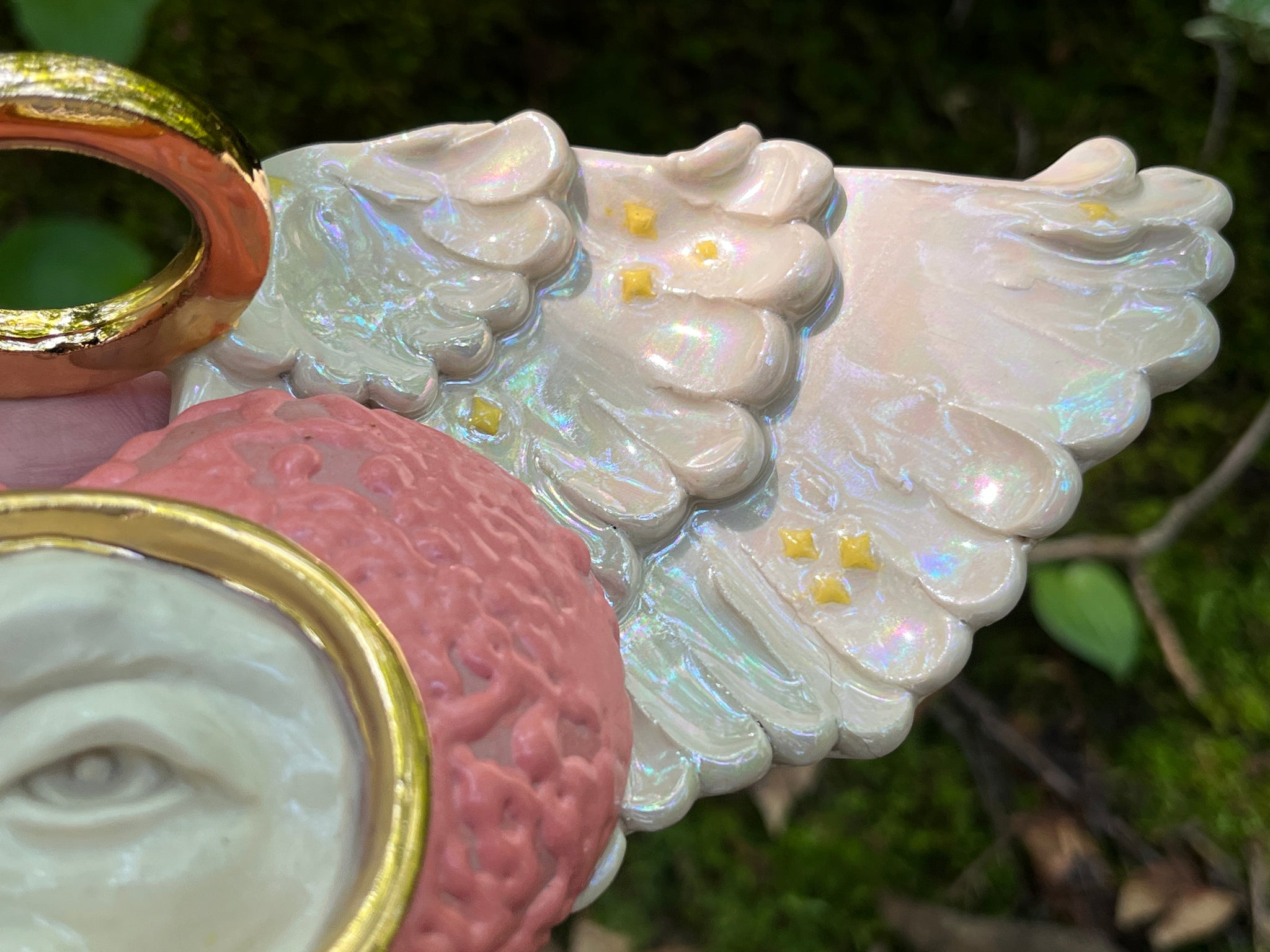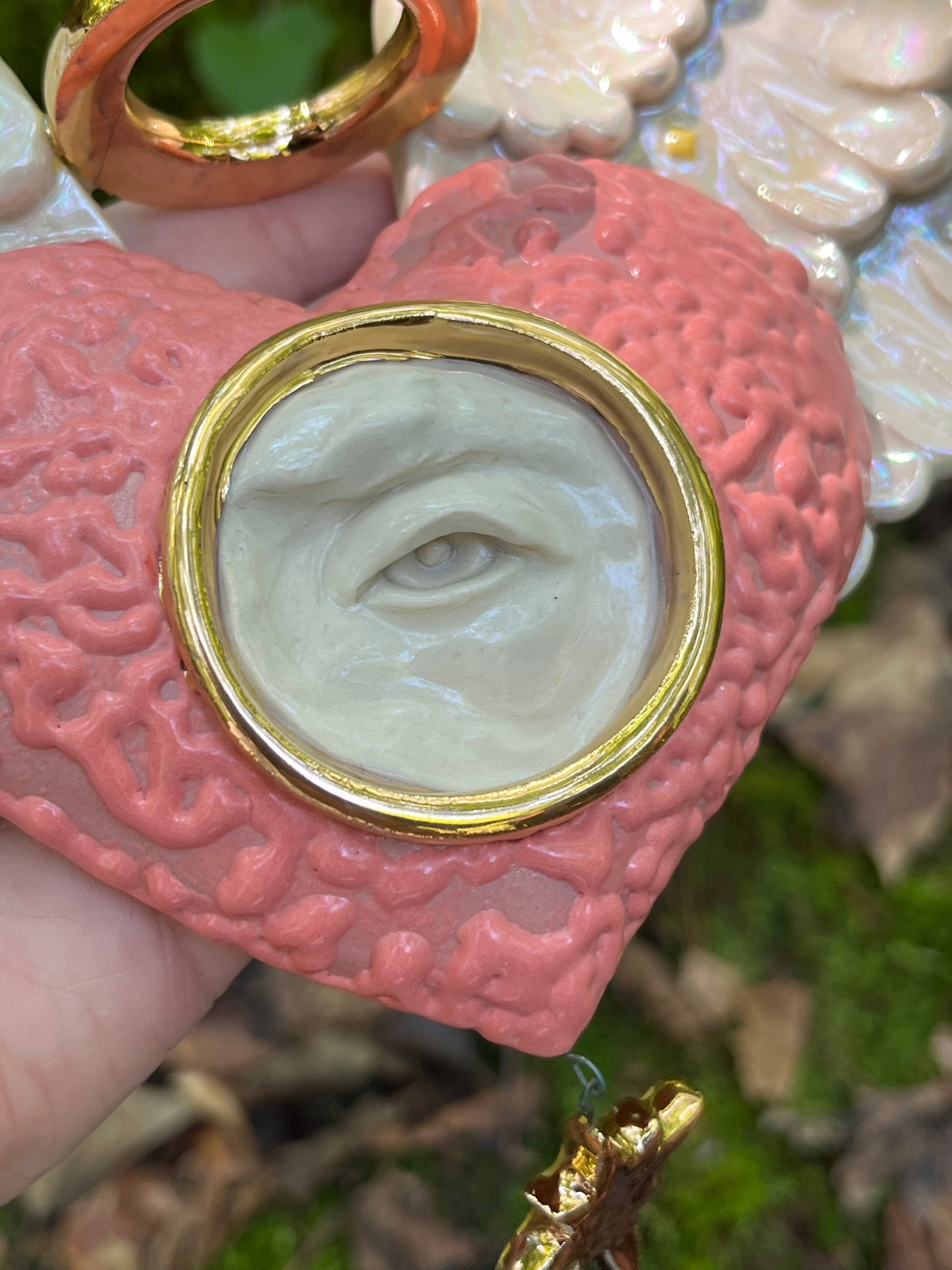 This sculpted winged heart features a vigilant eye at its center, crowned by a golden halo.